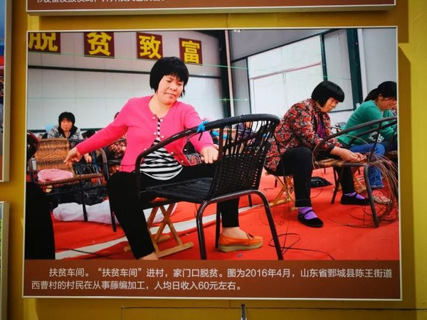 第五展區(qū)中關(guān)于扶貧的照片,大部分是生活化內(nèi)容,看上去十分真切、生動(dòng)。在展區(qū)一角,還有這么一張照片——這張照片是村民們從事藤編加工的照片,拍攝于山東鄄城西曹村,從照片上可以看到,3名婦女正在編織藤椅。據(jù)了解,她們的人均日收入能達(dá)到60元左右。這張照片也是解說(shuō)員介紹的重點(diǎn)。