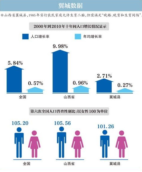 1985年,在全國(guó)普遍實(shí)行“一胎化”政策的背景下,翼城縣的農(nóng)民家庭允許生育二胎。但需要滿足“晚婚、晚育和生育間隔”這三個(gè)條件,即已婚女性不早于24周歲生育第一胎,30周歲后可生育第二胎(2009年后,提前到28周歲)。有專(zhuān)家將這一試驗(yàn)稱(chēng)為“翼城模式”。