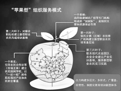 農(nóng)民教育培訓(xùn)最大的問題是組織問題,創(chuàng)新農(nóng)民教育培訓(xùn)模式,首先要創(chuàng)新農(nóng)民教育培訓(xùn)組織方式,有效破解教育培訓(xùn)“低水平簡單重復(fù)”和“搞培訓(xùn)不抓隊(duì)伍”問題。農(nóng)廣校堅持開放的大體系觀,創(chuàng)新機(jī)制模式打造資源集合平臺,推進(jìn)專門機(jī)構(gòu)、相關(guān)資源和市場主體三種力量結(jié)盟,探索建立政府部門統(tǒng)籌領(lǐng)導(dǎo)下的新型職業(yè)農(nóng)民教育培訓(xùn)“蘋果型”組織服務(wù)方式!耙粋果柄”是作為“國家隊(duì)”的專門機(jī)構(gòu)。由中央、省、市、縣四級建制農(nóng)廣校組成,起組織支撐和資源保證作用!叭~子”是相關(guān)資源的有序高效利用!暗谝黄~子”是依托鄉(xiāng)鎮(zhèn)(區(qū)域)農(nóng)技推廣機(jī)構(gòu)建立新型職業(yè)農(nóng)民培育基層站,將專門機(jī)構(gòu)的組織支撐和資源保證作用進(jìn)一步向鄉(xiāng)鎮(zhèn)(區(qū)域)延伸;“第二片葉子”是對接農(nóng)職院校建立培養(yǎng)基地,提供新型職業(yè)農(nóng)民高端培訓(xùn)和高職教育;“第三片葉子”是聯(lián)系現(xiàn)代農(nóng)業(yè)園區(qū)、農(nóng)業(yè)企業(yè)建立產(chǎn)業(yè)實(shí)訓(xùn)基地,服務(wù)新型職業(yè)農(nóng)民實(shí)習(xí)實(shí)踐!耙粋果實(shí)”是作為市場主體的新型農(nóng)業(yè)經(jīng)營主體。引導(dǎo)農(nóng)民合作社等建立農(nóng)民田間學(xué)校,以“一社一!钡牟季謱(shí)現(xiàn)對產(chǎn)業(yè)和農(nóng)民的全覆蓋!疤O果型”有機(jī)統(tǒng)一體,把政府部門的統(tǒng)籌主導(dǎo)職能、專門機(jī)構(gòu)的支撐保證作用、相關(guān)資源的有序高效利用機(jī)制導(dǎo)入市場主體,共同培育和服務(wù)新型職業(yè)農(nóng)民。