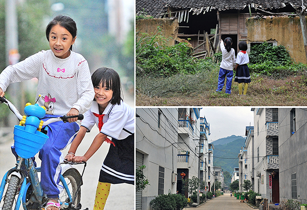 左圖:在江西上饒縣寶山丁移民新村,姐姐毛淑婷(左)和妹妹毛小悅在小區(qū)里騎車(chē)玩耍;右上:姐妹倆在山中荒廢的土坯房前;右下:這是姐妹倆現(xiàn)在居住的上饒縣寶山丁移民新村(9月28日攝)(拼版照片)。