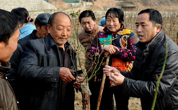1月6日,園藝專業(yè)畢業(yè)的佛坪縣委組織部副部長田間(右一)在西岔河鎮(zhèn)銀廠溝村苗木基地與群眾一起交流嫁接玫瑰修剪管護技術。全縣部門包聯(lián)、特聘專家教授、農業(yè)實用人才、致富能手,組建講師團、服務隊幫助群眾學技術,年培訓近百場次。