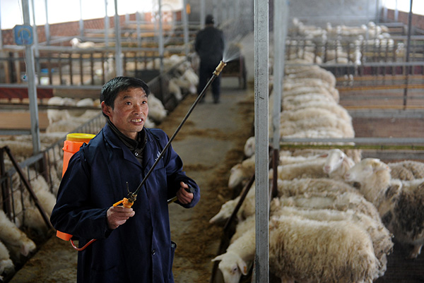 1月6日,西岔河鎮(zhèn)銀廠溝村黨支部書記馬光明在為養(yǎng)羊場地消毒。該村6名村組黨員率先發(fā)展肉牛和肉羊等種養(yǎng)產業(yè),實行股份制投資、分紅制度,以“黨支部+合作社+農戶”模式帶動54戶村民參股發(fā)展產業(yè),為村民增收達70余萬元。