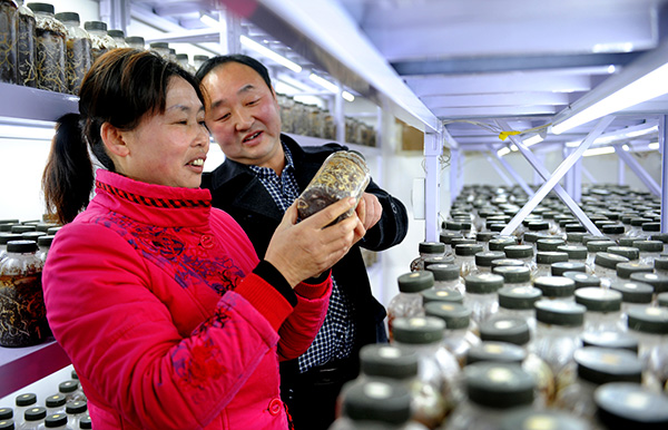 1月6日,鑫農食用菌專業(yè)合作社黨支部書記翟玉軍(右)夫婦在原種培育室檢查原種生長情況。該合作社年生產6大類食用菌菌種40萬公斤、50余萬瓶,帶動400多戶村民增收致富。
