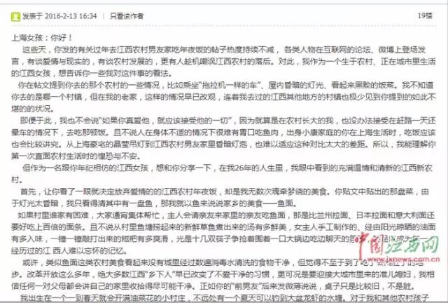 2月13日,一名自稱是在江西農村長大的網友“爾雅2016”在中國江西網(江西手機報)的“大江論壇”發(fā)帖,給這位上海女孩寫了一封信,講述了她眼中充滿溫情和清新的江西農村。