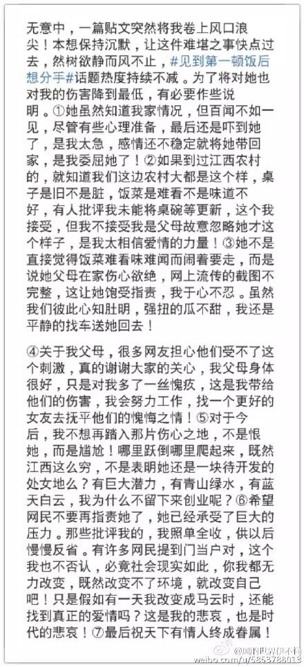 面對網上的眾說紛紜,2月10日,事件中的江西男友終于在微博上發(fā)表聲明,表示江西“有巨大潛力,有青山綠水,有藍天白云,我為什么不留下來創(chuàng)業(yè)呢”。這位江西小伙決定“改變自己”,留在家鄉(xiāng)創(chuàng)業(yè)的做法得到了許多網友的點贊。