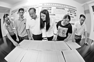 湖南省資興市是全國農(nóng)村集體產(chǎn)權制度改革試點縣市。新民農(nóng)村集體股份合作社成立于2015年2月,將資興市唐洞街道新民社區(qū)的農(nóng)村集體資產(chǎn)全部實行股權量化到人,以戶為單位登記并設立股權賬戶,發(fā)放股權證,2016年1月底實現(xiàn)第一次分紅。圖為9月28日,村民正在查看、核對股權分紅相關信息。朱孝榮鄧劍峰李鐵南攝