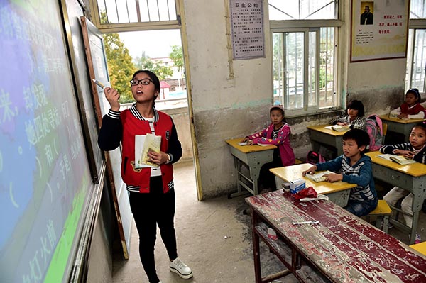 20歲的熊丹生長在大別山腹地的岳西縣店前鎮(zhèn)徐良村,通過付出比同齡人更多的努力,最終有機(jī)會走出大山。今年她從安徽桐城師范高等?茖W(xué)校畢業(yè)后,卻毅然選擇回到家鄉(xiāng)成為店前鎮(zhèn)河西村小學(xué)的一名特崗教師。她在教授語文、思想品德等課程之余還承擔(dān)起班級孩子的音樂、美術(shù)等教育。熊丹說:“扶貧必扶智,貧困山區(qū)的孩子們渴望得到更好的受教育機(jī)會,我們特崗教師要盡自己所能照亮貧困山村學(xué)生們的求知路!