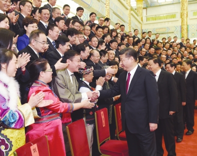 上午9時(shí)30分,習(xí)近平等來到人民大會堂金色大廳,同代表們親切握手,并合影留念。