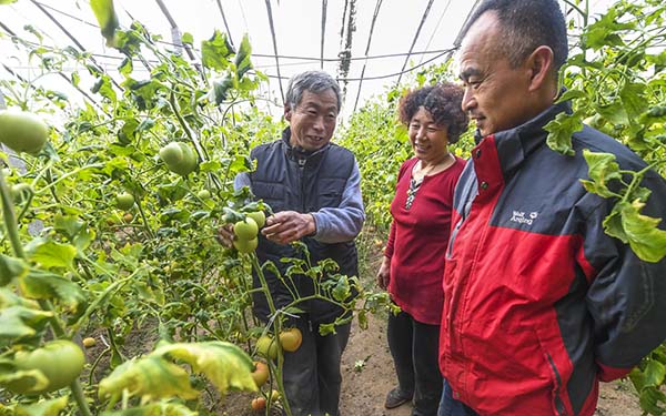 1月16日,河北省廊坊市廣陽區(qū)九州鎮(zhèn)黨員志愿者(左)在向幫扶對象講解蔬菜種植管理知識。