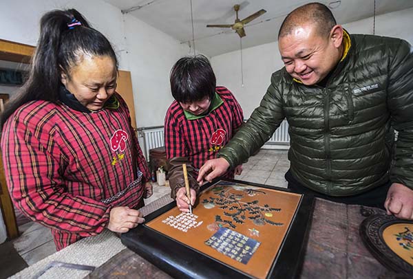 1月16日,河北省廊坊市廣陽區(qū)九州鎮(zhèn)南漢村手藝人(右)向幫扶對象講解鑲嵌技巧。