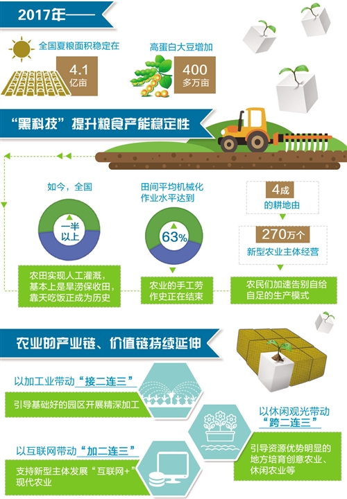 今年全國夏糧面積穩(wěn)定在4.1億畝,高蛋白大豆增加400多萬畝。糧食產(chǎn)能穩(wěn)定離不開播種面積,更離不開節(jié)水節(jié)肥的“黑科技”。如今,全國一半以上農(nóng)田實現(xiàn)人工灌溉,基本上是旱澇保收田,靠天吃飯正成為歷史;田間平均機械化作業(yè)水平達到63%,農(nóng)業(yè)的手工勞作史正在結(jié)束;4成耕地由270萬個新型農(nóng)業(yè)主體經(jīng)營,農(nóng)民們加速告別自給自足的生產(chǎn)模式?萍祭顺迸炫龋覈r(nóng)業(yè)正面臨千年未有之變局。