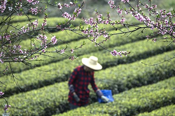 3月29日,湖北省宜昌市夷陵區(qū)太平溪鎮(zhèn)落佛村一名茶農在采摘明前茶。