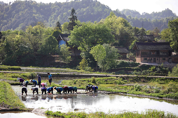 4月22日,貴州省丹寨縣興仁鎮(zhèn)城望村的村民在水田里育秧。