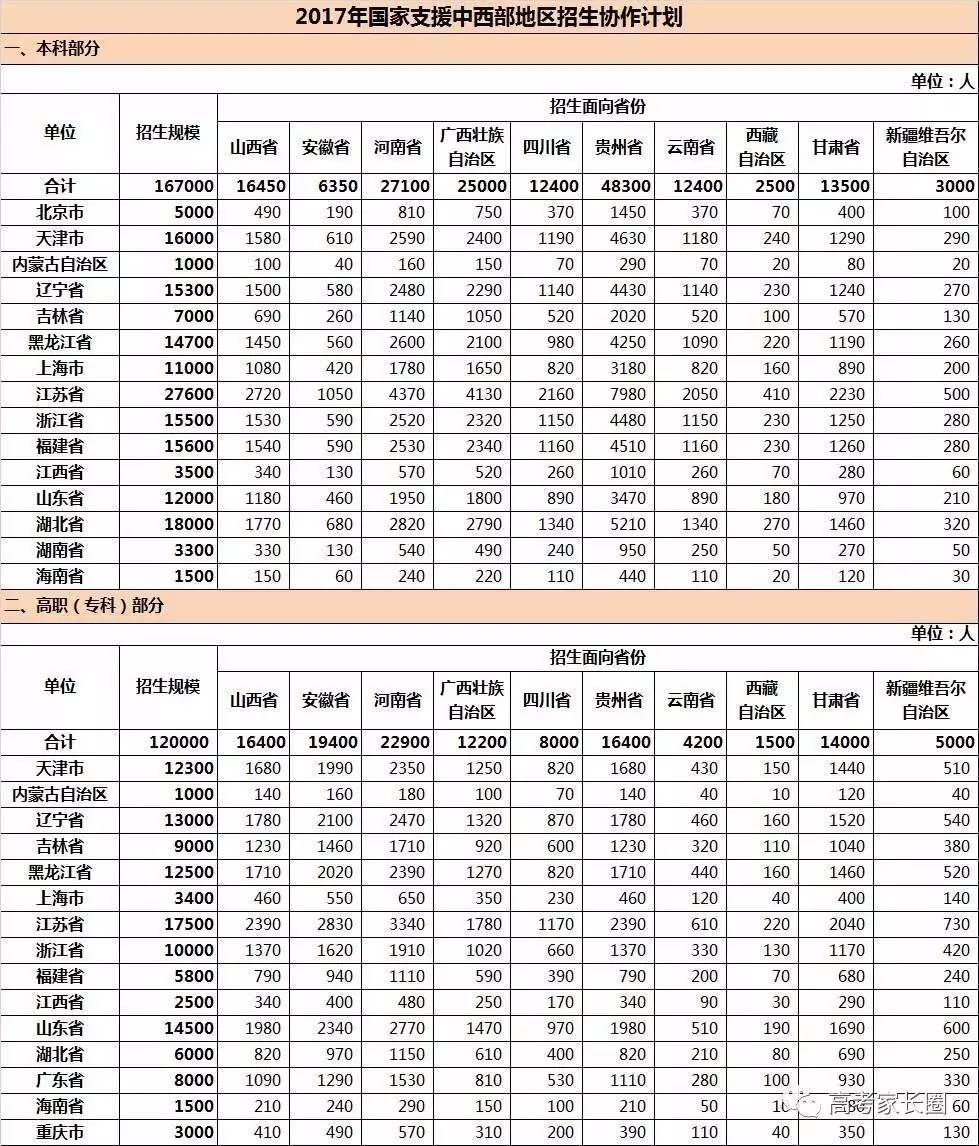 2017年,國家支援中西部地區(qū)招生協(xié)作計(jì)劃共安排28.7萬人,其中本科16.7萬人、?12萬人,主要由公辦高校承擔(dān)。