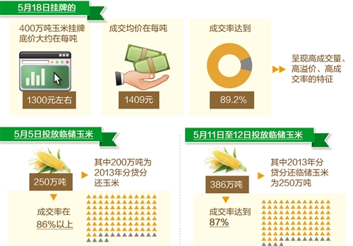 5月18日掛牌的400萬(wàn)噸玉米掛牌底價(jià)大約在每噸1300元左右,成交均價(jià)在每噸1409元,成交率達(dá)到89.2%,呈現(xiàn)高成交量、高溢價(jià)、高成交率的特征。