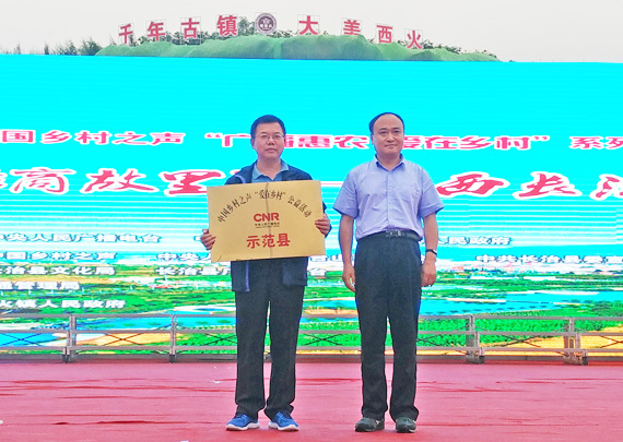 中央人民廣播電臺(tái)社教節(jié)目中心黨總支專(zhuān)職書(shū)記彭忠蛟授“中國(guó)鄉(xiāng)村之聲愛(ài)在鄉(xiāng)村公益活動(dòng)示范縣”牌匾,長(zhǎng)治縣廣播電視臺(tái)臺(tái)長(zhǎng)馮鵬威接牌。