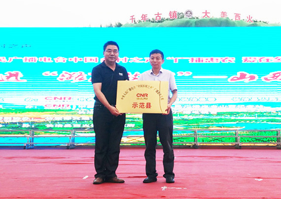 中央人民廣播電臺(tái)山西記者站康維佳站長(zhǎng)授“中央人民廣播電臺(tái)中國(guó)鄉(xiāng)村之聲廣播惠農(nóng)工程示范縣”牌匾,中共長(zhǎng)治縣委宣傳部張延節(jié)部長(zhǎng)接牌。