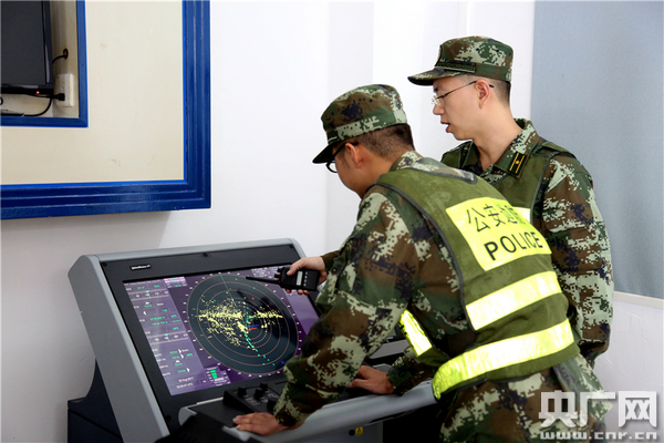 汕頭邊防支隊邊防媽嶼所官兵正在使用衛(wèi)星定位系統(tǒng)檢測周圍漁船停泊情況。