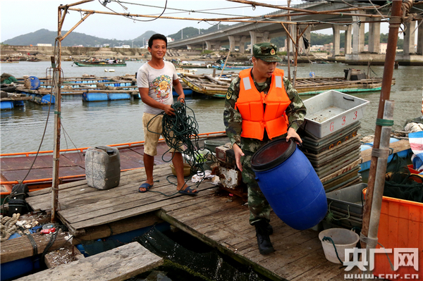 汕頭邊防支隊達(dá)濠邊防派出所官兵正在幫養(yǎng)殖戶收拾養(yǎng)魚工具。周峰 攝