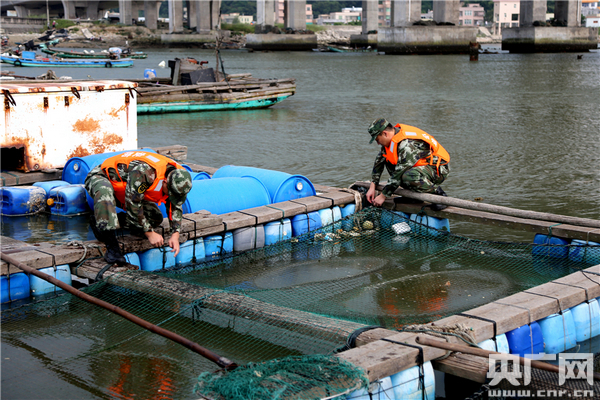 汕頭邊防支隊達(dá)濠邊防派出所官兵正在幫助漁民加固漁排。周峰 攝