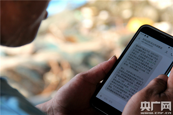 漁民向記者展示媽嶼邊防派出所邊防官兵發(fā)送的臺風(fēng)預(yù)警短信。劉建高 攝