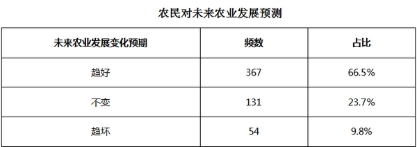 數(shù)據(jù)顯示,有66.5%的受訪者認(rèn)為未來農(nóng)業(yè)發(fā)展趨好;23.7%的受訪者認(rèn)為未來農(nóng)業(yè)發(fā)展趨勢不變;只有9.8%的受訪者認(rèn)為未來農(nóng)業(yè)發(fā)展趨壞。