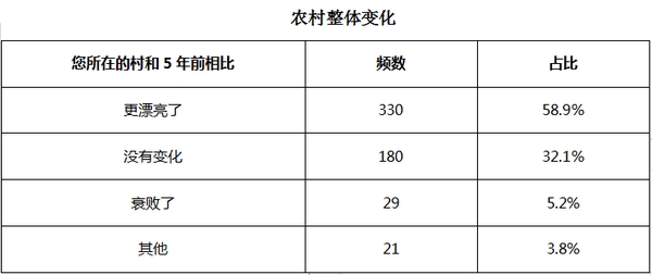 具體而言,有超過一半受訪者認(rèn)為所在村與5年前相比變得更加漂亮;只有5.2%的受訪者表示所在村與5年前相比變得衰敗了。