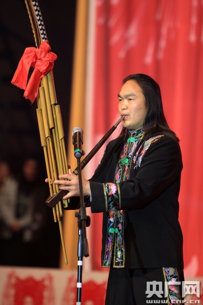楊正平在頒獎(jiǎng)晚會(huì)現(xiàn)場演奏蘆笙