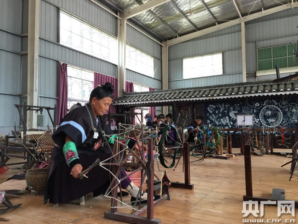 在苗族姑娘歐陽珍珍的博物館一樓,幾十臺(tái)從民間搜羅的古老的紡線機(jī)與紡織機(jī)發(fā)出“沙沙沙”的聲音,一群苗族的老人正在做著她們一輩子都在做的事兒,紡線與織布。
