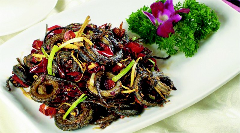 盤鱔作法也非常講究,先選規(guī)格適宜的活鱔魚,一般半兩左右為宜,置于一盛滿清水的盆中,放入少許植物油,讓其退出身內(nèi)污物,兩小時后撈起,然后放入燒開的沸水中殺死,去其外表粘液,再配上八角、蔥等佐料干炒,直至鱔魚盤曲、味香色濃為止,一道正宗的“宜城盤鱔”便宣告完成。