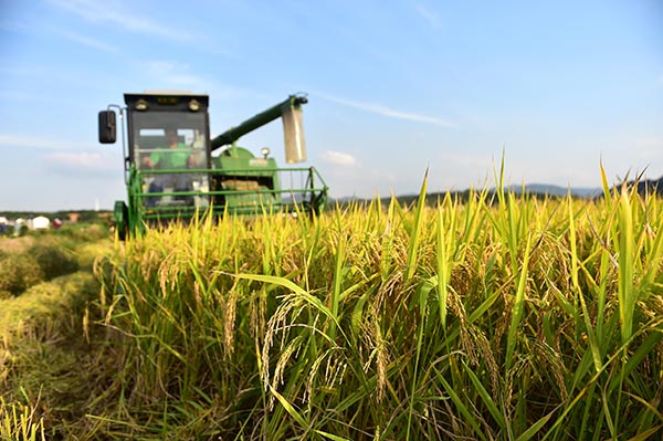 9月20日,在安徽涇縣晏公鎮(zhèn),農(nóng)民駕機收割水稻。