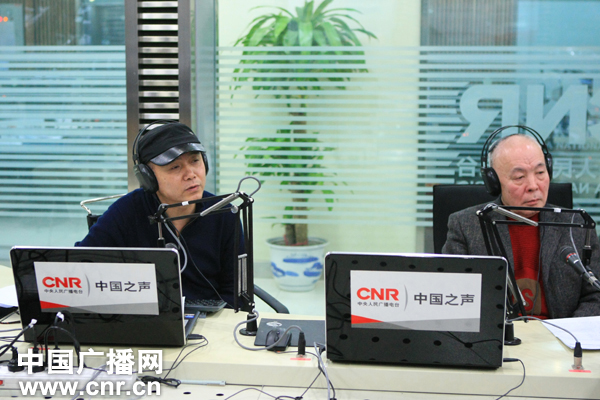 京韻大鼓表演藝術(shù)家種玉杰先生(左)和著名相聲演員李增瑞老師做客《中國大舞臺》,圖為節(jié)目現(xiàn)場直播中 攝影/陳江南