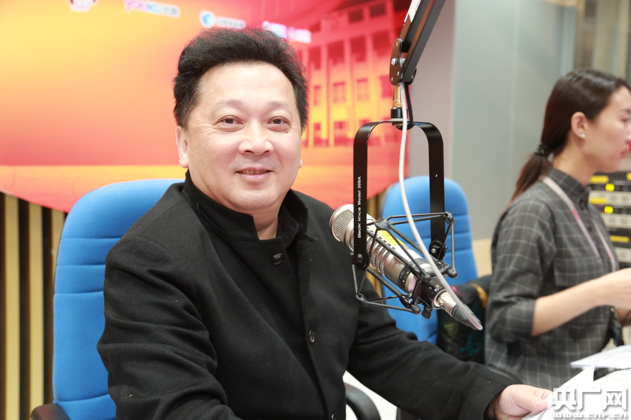 中國(guó)文聯(lián)演藝中心主任、全國(guó)政協(xié)委員、著名軍旅歌唱家、中國(guó)文學(xué)藝術(shù)界2016春節(jié)大聯(lián)歡——《百花迎春》總導(dǎo)演郁鈞劍做客中國(guó)之聲《中國(guó)大舞臺(tái)》(央廣網(wǎng) 李聰格 攝)