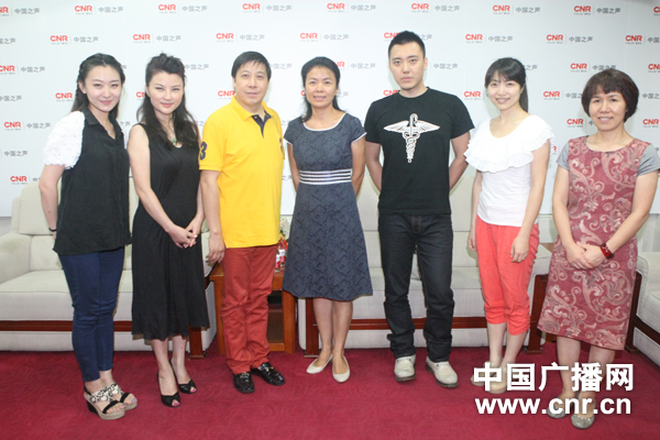 著名歌唱家魏金棟(左三)、青年歌手朱砂(左二)、獨唱演員岳璐(左一)與中國之聲直播工作人員合影(中廣網(wǎng)記者陳江南_攝)