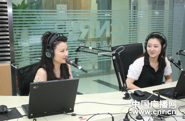 中國廣播藝術(shù)團(tuán)青年歌手朱砂(左)與獨(dú)唱演員岳璐(右)在直播間參加直播(中廣網(wǎng)記者陳江南_攝)