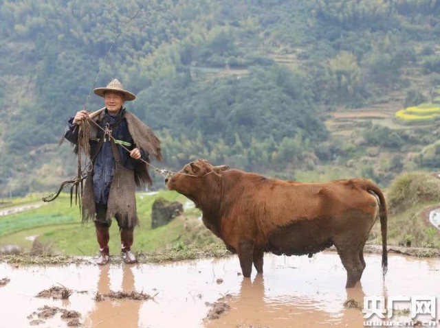 在春耕現(xiàn)場,開犁之前,村里的村民要用包著松樹針葉汁的糯米麻糍去喂牛,意思是“開犁祭!。“這樣做一方面給牛加力以示酬謝,一方面預兆今年農(nóng)作物大豐收。在‘開犁祭牛’后,還要用牛拉犁開始耕田翻土。等犁好田,我們還要繼續(xù)用牛拉耖去平整新翻的泥土,為播撒谷種做準備。平整好后,再用四齒耙糊好田埂,以便加固防漏”,當?shù)卮迕裣蛴浾呓榻B道。