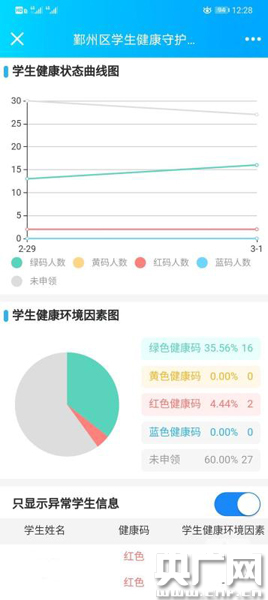 “班主任花一個星期統(tǒng)計的數(shù)據(jù),在平臺上幾秒鐘就呈現(xiàn)完成,學生返校時不用一一核對健康碼,可以節(jié)約大量時間!臂粗輩^(qū)朝暉實驗學校是一所外來民工子弟學校,校長馬任在平臺上線首日監(jiān)測全校1326名學生發(fā)現(xiàn),目前已有6名在湖北的學子為紅碼,有412名學生未領(lǐng)健康碼,學校正催促家長為孩子領(lǐng)碼完善大數(shù)據(jù)監(jiān)測。