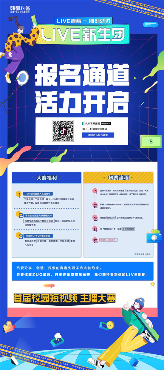 本次校園短視頻·主播大賽將聯(lián)手無(wú)憂傳媒與二咖傳媒兩大頂級(jí)MCN機(jī)構(gòu),并邀TOP級(jí)抖音達(dá)人組成導(dǎo)師團(tuán)助力參賽選手進(jìn)階成長(zhǎng),一起創(chuàng)造未來(lái)直播新秀的無(wú)限可能。據(jù)介紹,10月15日至30日,報(bào)名通道正式活力開(kāi)啟。