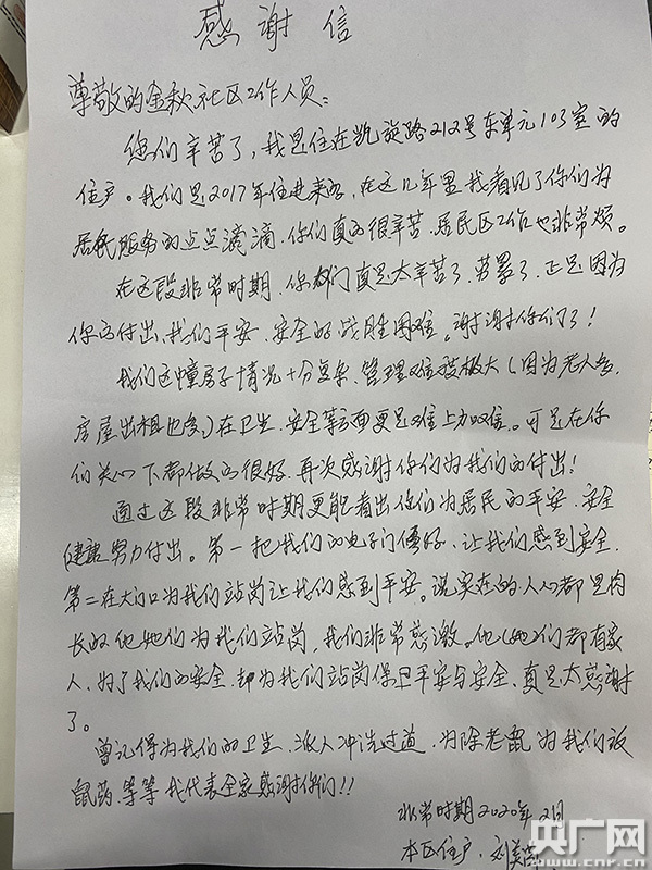 央廣網(wǎng)杭州2月16日消息(記者 魏煒 通訊員 高宇)“說實(shí)在的,人心都是肉長的,他們?yōu)槲覀冋緧,我們非常感激!他們都有家人,為了我們的安全,卻為我們站崗保衛(wèi)平安與安全,真的太感謝了!”近日,江干區(qū)凱旋街道金秋花園社區(qū)收到了一封社區(qū)居民送來的感謝信。雖然只是薄薄的一張紙,但滿滿紙面的文字勝過千言萬語,這是居民群眾對(duì)社區(qū)工作的認(rèn)可和肯定。這一份心意被分享在社區(qū)工作群中,讓身在“前方”和“后方”的大家都備受鼓舞。