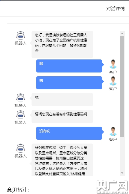 除了主動(dòng)呼叫,“小清”還能被動(dòng)接聽(tīng),通過(guò)智能語(yǔ)音對(duì)話,對(duì)社區(qū)轄區(qū)內(nèi)居民和企業(yè)的杭州健康碼申領(lǐng)及使用情況進(jìn)行自動(dòng)采集,包括已申領(lǐng)綠碼、紅碼、黃碼等各類(lèi)情況。對(duì)于還沒(méi)有申領(lǐng)健康碼的人員,“小清”還會(huì)告知申領(lǐng)方式,進(jìn)行講解。