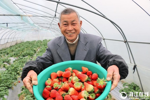 1月17日,湖州許溇村,今年的頭茬大棚草莓已進(jìn)入初果期,果農(nóng)忙采摘,商販忙銷售,頭茬草莓搶“鮮”上市。(浙江在線拍友 朱偉良 攝)