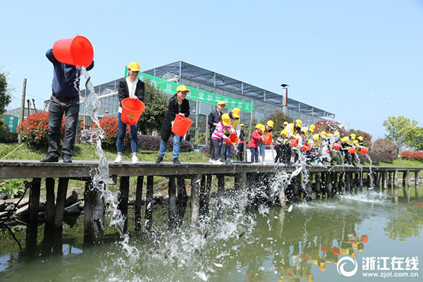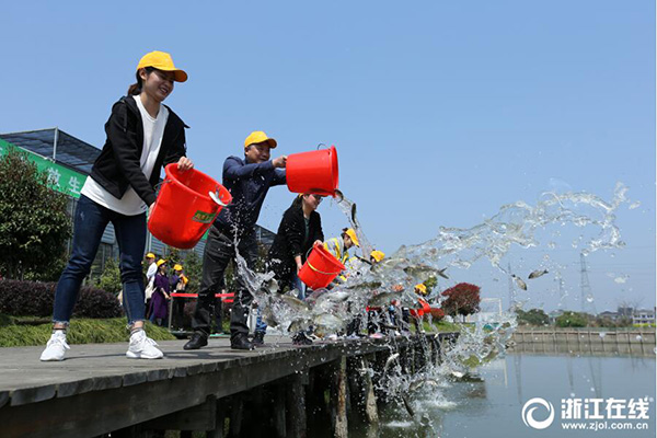 3月27日,德清縣乾元鎮(zhèn)各級人大代表、新居民以及當地幼兒園小朋友等50多人,在該鎮(zhèn)聯(lián)合村、恒星村等地,把花鰱、草魚以及花骨魚等2萬余尾魚苗放歸清澈的河水中,以進一步改善水質,確!拔逅仓巍背晒。(沈興華 倪立芳 攝)