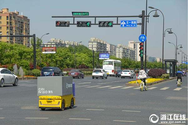 2018年4月18日,在杭州市文一西路上,一輛半人高的四方小車,在無人駕駛的情況下,一路停停走走,行駛在送快遞的路上。據(jù)了解,這是菜鳥旗下ET物流實驗室研發(fā)的無人車,正在進(jìn)行路測。當(dāng)日,在10公里的路測路段,無人車已經(jīng)能夠完成內(nèi)部的文件等收發(fā)配送。菜鳥無人車定位在末端配送,車速最高控制在15km/小時,車輛制動距離可以控制在0.5——0.3米。菜鳥無人車量產(chǎn)商用在即,年內(nèi)將全面進(jìn)入末端進(jìn)行配送。(記者 楊曉軒 攝)