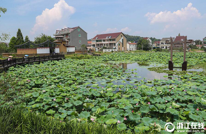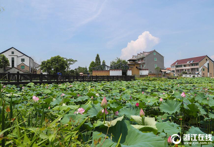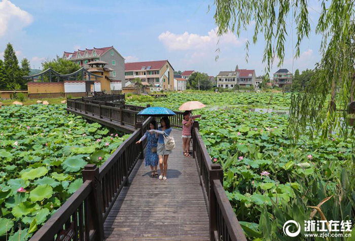 7月25日,在湖州德清下渚湖街道沿河村的小公園,廊橋、荷花、游步道相互映襯,猶如一張美麗的鄉(xiāng)村畫(huà)卷。