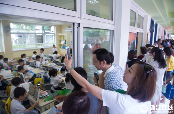 9月2日,杭州長江實驗小學開學,一年級生迎來小學第一堂課。教室內(nèi)小朋友認真聽課,教室外窗口門框邊倚靠著很多圍觀家長。爺爺奶奶爸爸媽媽齊刷刷地簇擁在教室外觀望,時而拿出手機記錄孩子們的人生第一課。