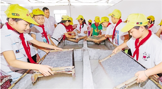 桃花紙是一種用于書寫和繪畫的傳統(tǒng)紙質(zhì)材料。近日,杭州市臨安區(qū)於潛鎮(zhèn)千洪小學(xué)的孩子們來到位于當(dāng)?shù)貤詈榇宓奶一埛沁z文化體驗(yàn)園,體驗(yàn)桃花紙的制作流程,通過實(shí)踐更好地了解非遺知識。(本報(bào)記者 林云龍 胡楊 攝)