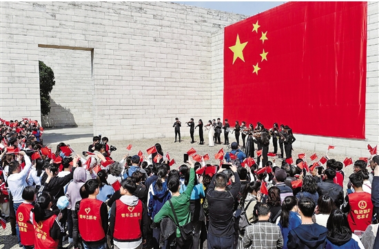 3月17日,文藝工作者在位于杭州余杭的良渚博物院深情朗誦、引吭高歌,以一場快閃活動帶動現(xiàn)場觀眾表達愛國心聲。(記者 潘海松 攝)