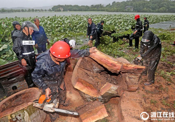 8月10日,臺風“利奇馬”凌晨登陸后,杭州多處樹木倒伏,西湖景區(qū)相關部門工作人員全力以赴搶扶樹木,確保道路暢通。