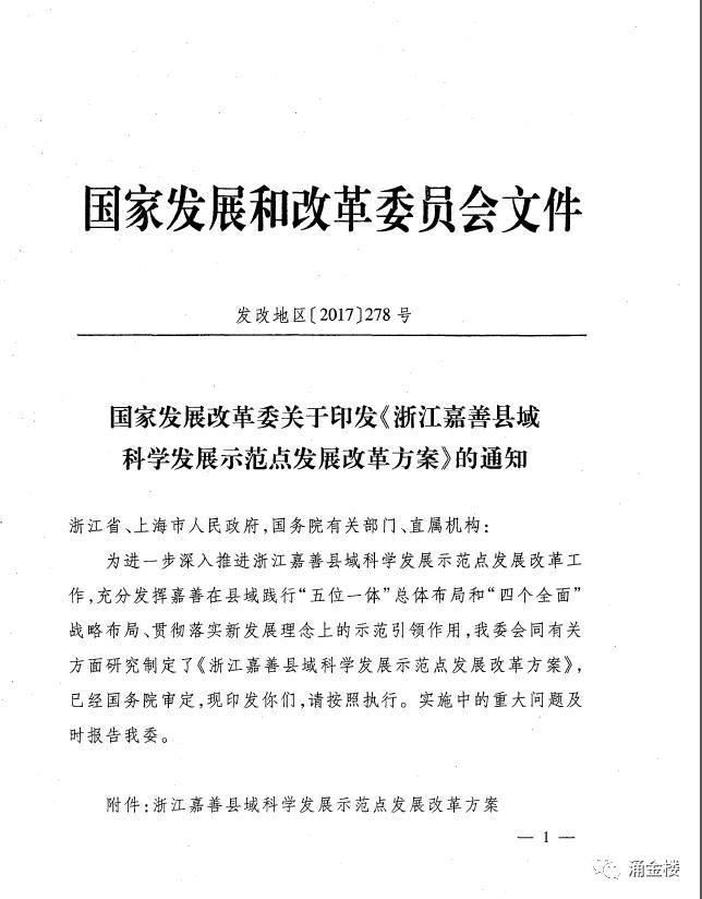 2017年2月16日,國家發(fā)展改革委關(guān)于印發(fā)《浙江嘉善縣域科學(xué)發(fā)展示范點(diǎn)發(fā)展改革方案》的通知。 ( 記者 張超 劉樂平)