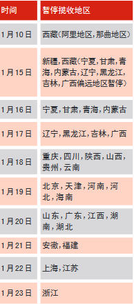 “目前,發(fā)往西藏、新疆的快件已經(jīng)暫停攬收!弊蛱欤瑴刂葜型、圓通等多家快遞公司如此表示。據(jù)了解,各家快遞公司已經(jīng)進(jìn)入“春節(jié)模式” ,一些偏遠(yuǎn)地區(qū)的快件已經(jīng)停止收件。而從1月16日開(kāi)始,更多地區(qū)將暫停攬件;不過(guò),浙江地區(qū)的快件收發(fā)每年都是“堅(jiān)持到最后”的,今年預(yù)計(jì)在1月22-24日停止。
